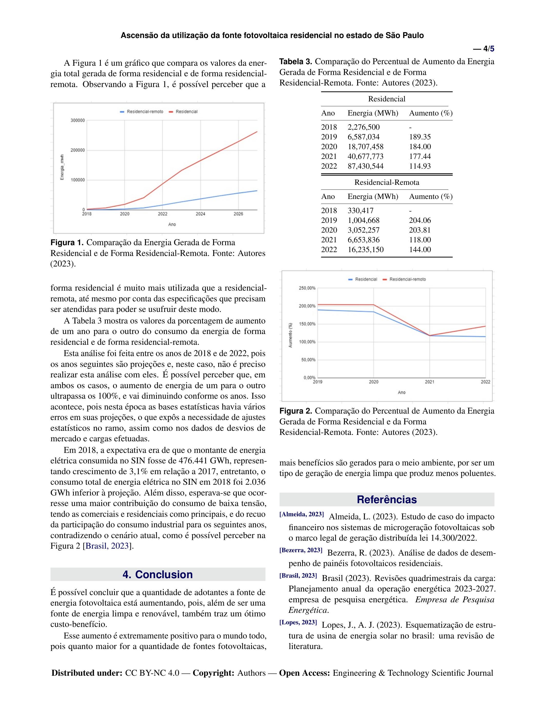 Tabela 3. Comparação do Percentual de Aumento da Energia Gerada de Forma Residencial e de Forma Residencial-Remota. Fonte: Autores (2023).